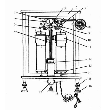 1橫梁 2平衡螺絲 3吊耳 4指針 5支點刀 6框罩 7圈碼 8指數盤 9承重刀 10支架 11阻尼內筒 12投影屏 13稱盤 14盤托 15螺旋腳 16墊腳 17開關旋鈕(升降樞) 18微動調節桿