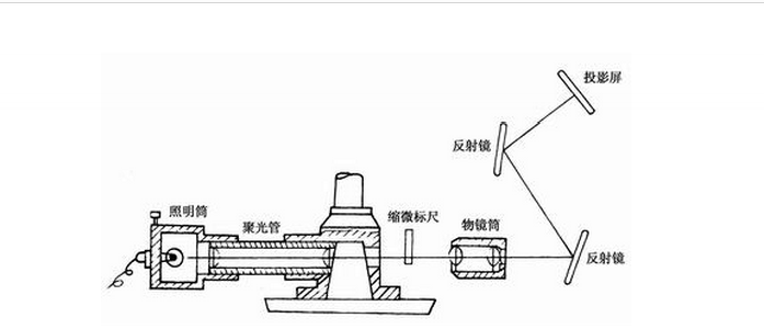 光源發出的光經聚光管聚光后,照在指針下端的透明縮微標尺上,再經過放大鏡筒(物鏡筒)放大,由反射鏡反射到投影屏光屏,