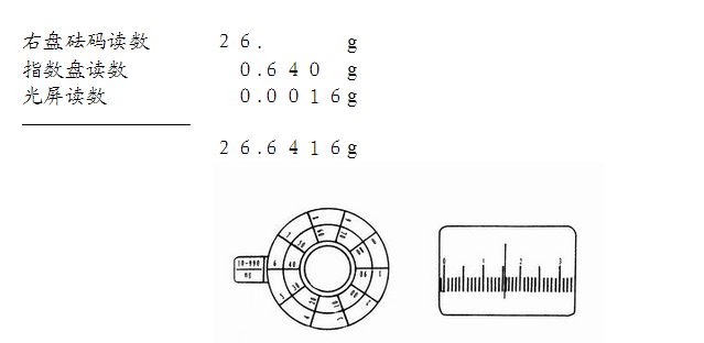 ③光屏讀數(10mg以內)的確定:內圈確定后,將升降旋鈕緩緩全開,此時光屏上標尺移動緩慢,待光屏上標尺穩定后即可從光屏上讀出10mg以內的數值(標尺上1小格為0.1mg,不足1小格時采用“四舍五入”)。