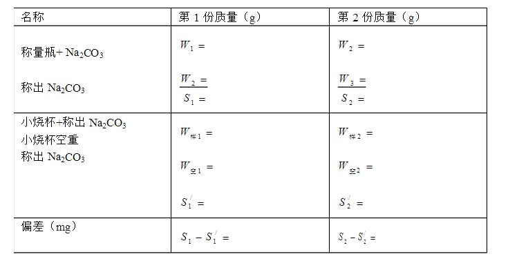 記錄1W;從其中移取約0.3~0.4g(1/3左右)于**個小燒杯中后,精確稱量剩余質量,記錄2W;從中再移取約0.3~0.4g于第二個小燒杯中,精確稱量剩余質量,記錄3W。 3. 再分別稱量已裝有Na2CO3樣品的小燒杯的質量,記錄1樣W和2樣W。 4. 結果的檢驗