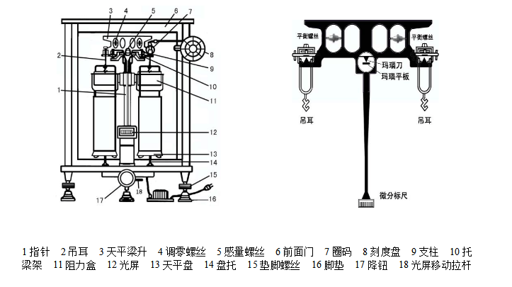 (1) 天平梁:天平梁是天平的主要部件之一,梁上左、中、右各裝有一個瑪瑙刀口和瑪瑙平板。裝在梁中央的瑪瑙刀刀口向下,支承于瑪瑙平板上,用于支撐天平梁,又稱支點刀。裝在梁兩邊的瑪瑙刀刀口向上,與吊耳上的瑪瑙平板相接觸,用來懸掛托盤。瑪瑙刀口是天平很重要的部件,刀口的好壞直接影響到稱量的精確程度。瑪瑙硬度大但脆性也大,易因碰撞而損壞,故使用時應(yīng)特別注意保護(hù)瑪瑙刀口。