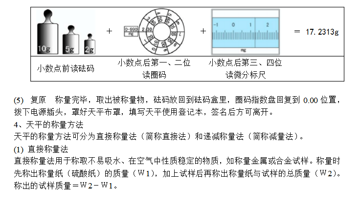 天平的讀數(shù)方法:砝碼+圈碼+微分標(biāo)尺,即小數(shù)點前讀砝碼,小數(shù)點后**、二位讀圈碼(轉(zhuǎn)盤前二位),小數(shù)點后第三、四位讀微分標(biāo)尺。(如下圖W=17.2313g)。